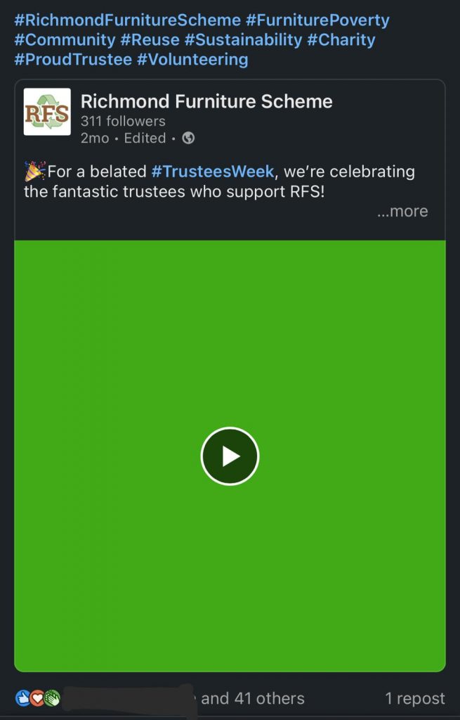 Started with admin and came across ‘#TrusteesWeek’ on social media, where charities thank their trustees. I worked on our own by: